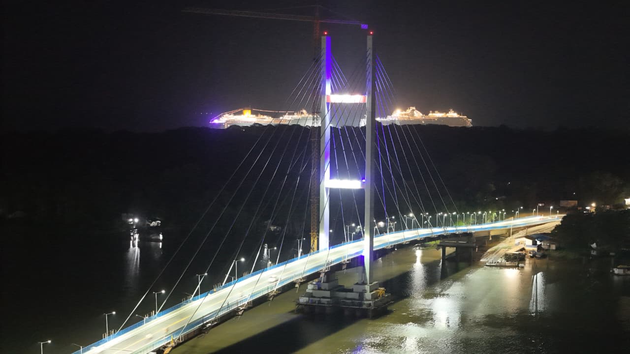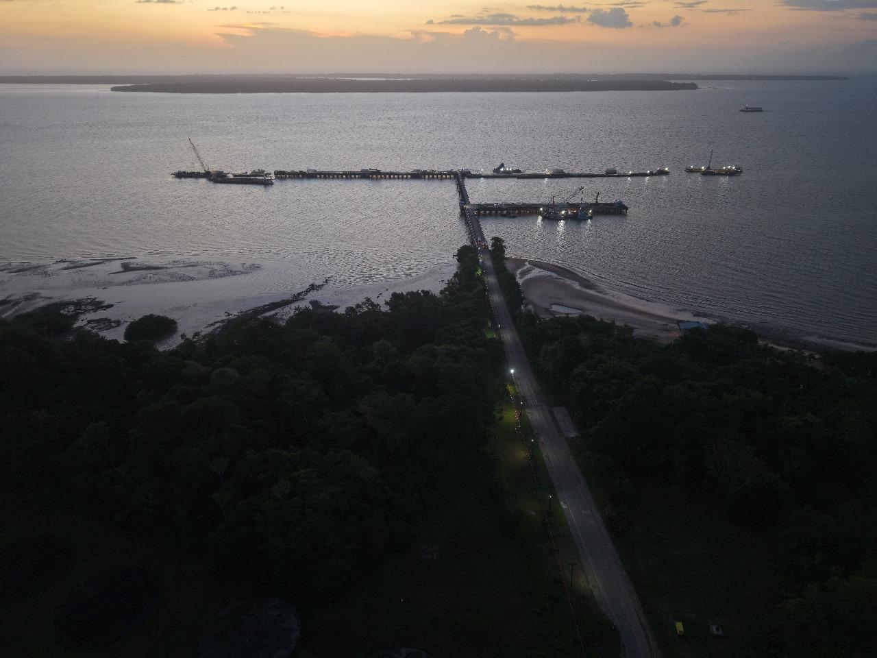 Vista aérea das obras do porto para a COP 30 e da ponte sobre o Rio Maguari, em Belém/PA. o LSE é responsável pelo gerenciamento de ambas as frentes, contribuindo ativamente para o desenvolvimento urbano e a preparação da capital para sediar a COP 30.